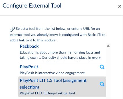 • The previous version of PlayPosit is available until the end of the semester. The previous version is in external tools as PlayPosit. The upgraded version is the PlayPosit LTI 1.3 Tool.