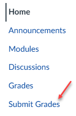 Faculty can submit grades in Canvas using the Submit Grades link in the course navigation menu.