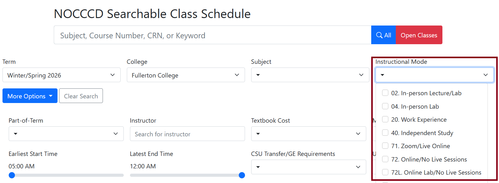 Use the searchable class schedule and the Instructional Mode filter to display “Online/No Live Sessions” courses: