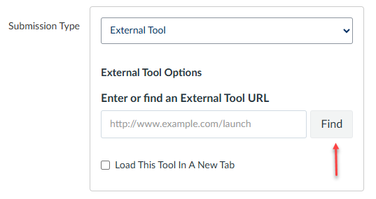 4. Select External Tool in the Submission Type dropdown and then use the Find button to bring up the list of external tools