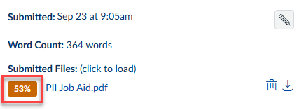 2. In Speedgrader, you will see the similarity score in the feedback panel. The results are color-coded (blue: no matching text, green: one word to 24% matching text, yellow: 25-49% matching text, orange: 50-74% matching text, red: 74-100% matching text)