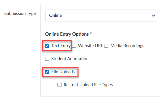 4. Select Online in the Submission Type dropdown and then select Text Entry and/or File Uploads as the entry options