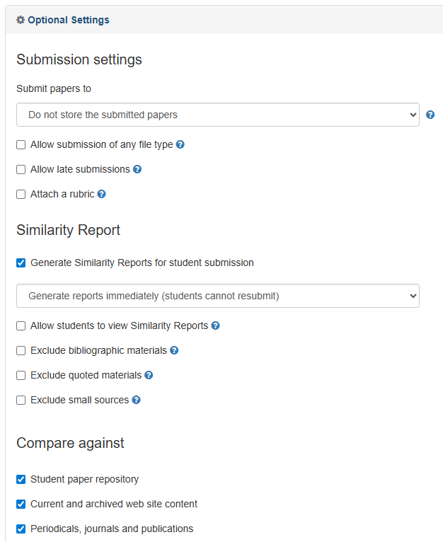 1. Open the Optional Settings panel and select the appropriate settings for student paper storage and the similarity report
