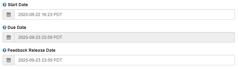 1. Review and adjust the Start and Feedback Release Dates as needed. (The due date is pulled from the Canvas settings and cannot be changed here.)